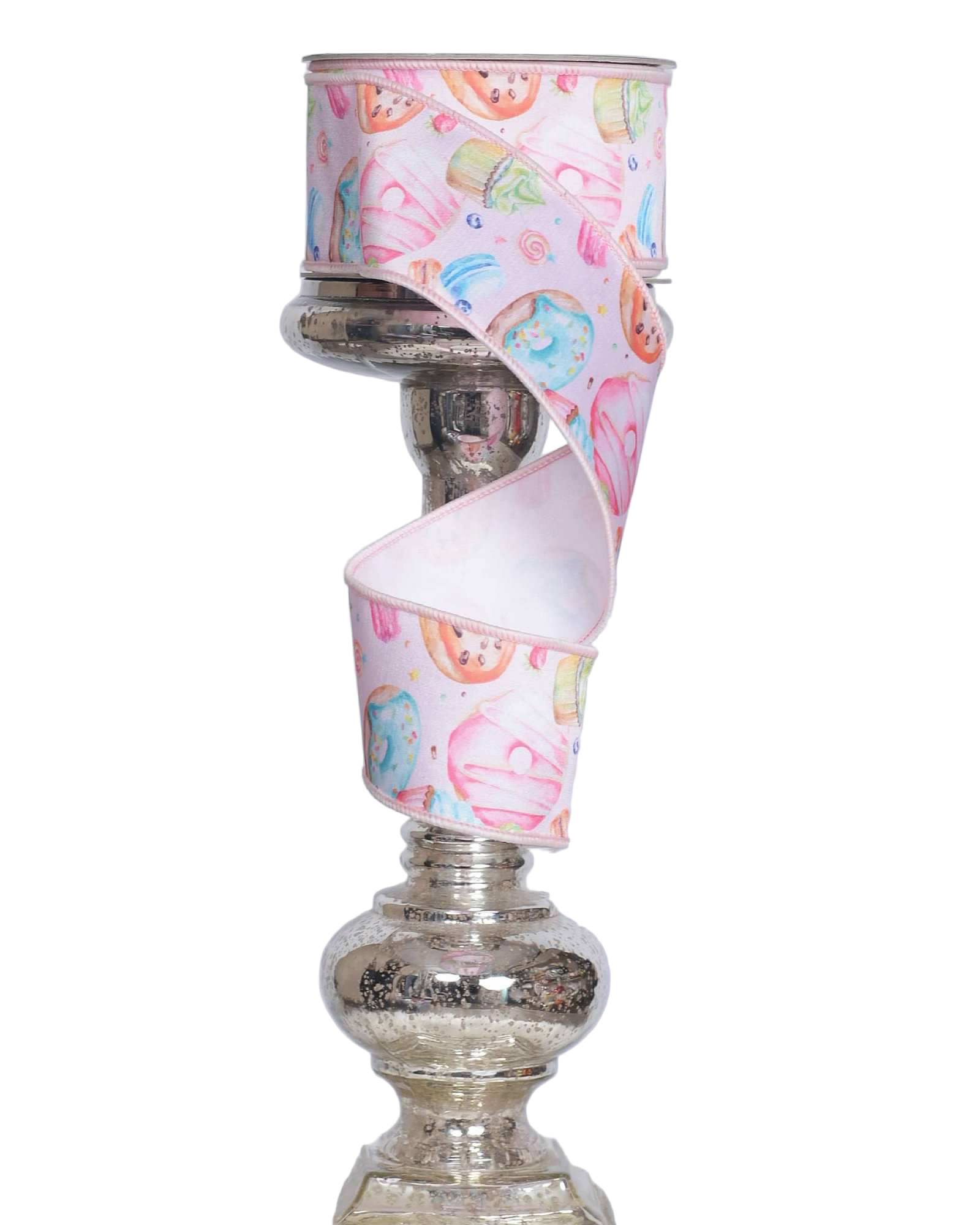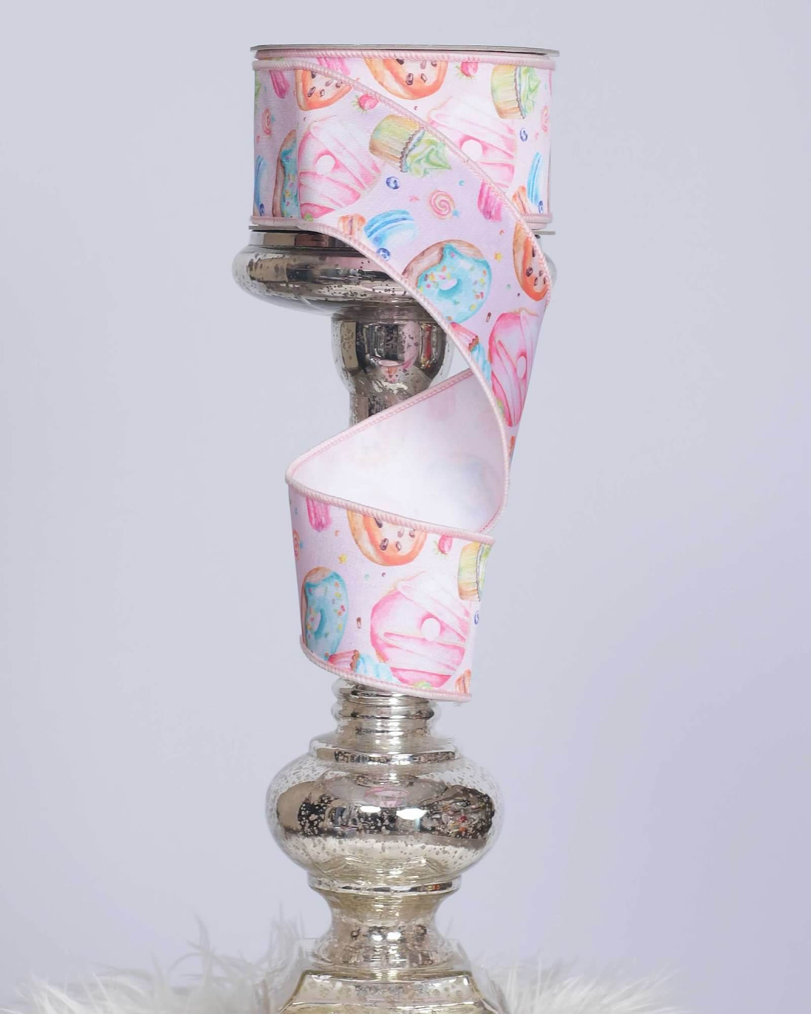 A charming wired ribbon featuring soft pastel pastry designs, perfect for adding a sweet, whimsical touch to gift wrapping, crafts, wreaths, and décor. The wired edges provide excellent structure, making it easy to create crisp bows that hold their shape beautifully.